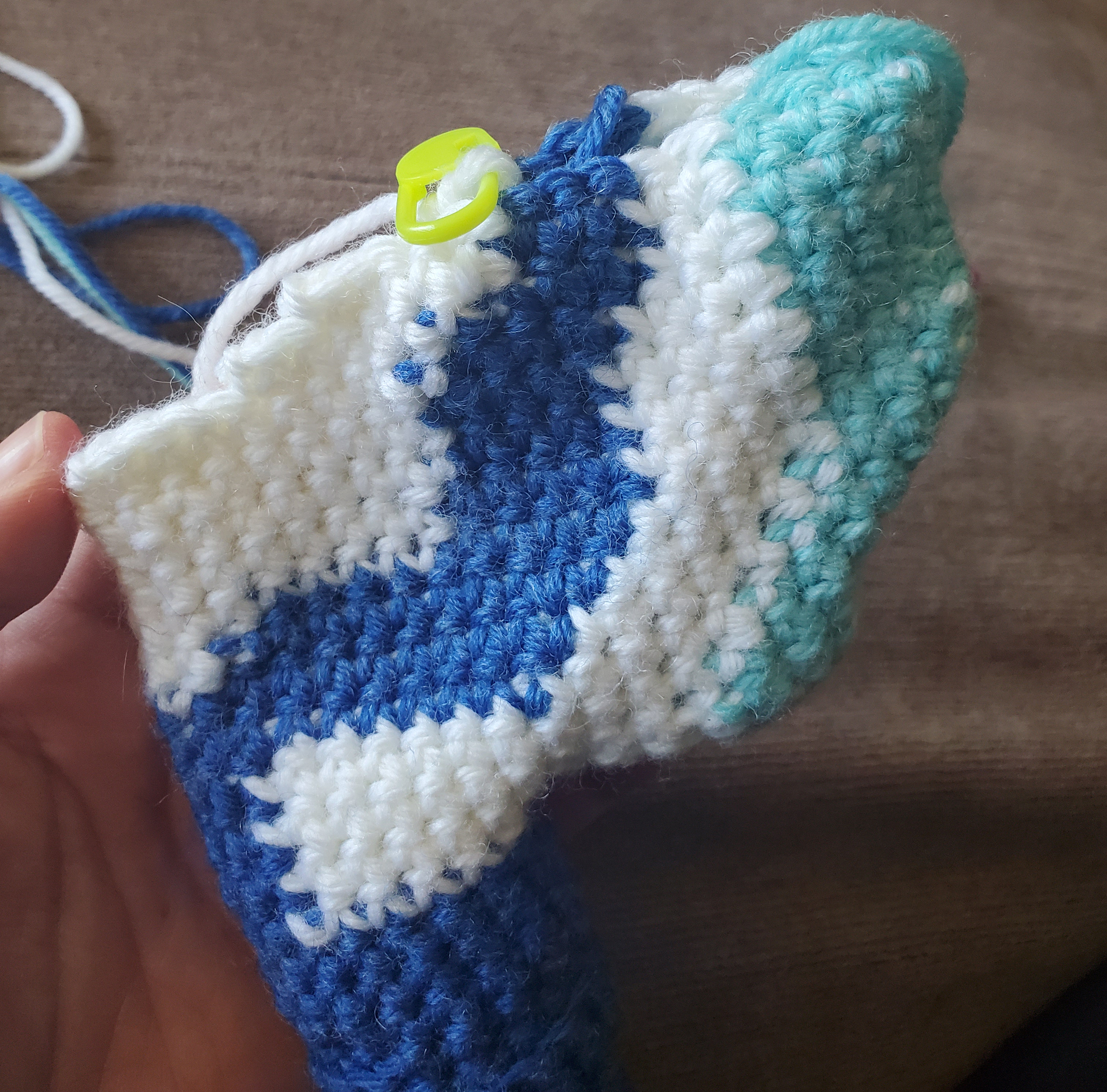 Row 38 (41st): {W} Sc x6, {B} Sc x4, {W} Sc x4, {LB} Sc x8, {W} Sc x3, {B} Sc x4, {W} Sc x10, turn and Sc across both the current loop and the one on the opposite row to close it up, 2 times. Here’s what that will look like: