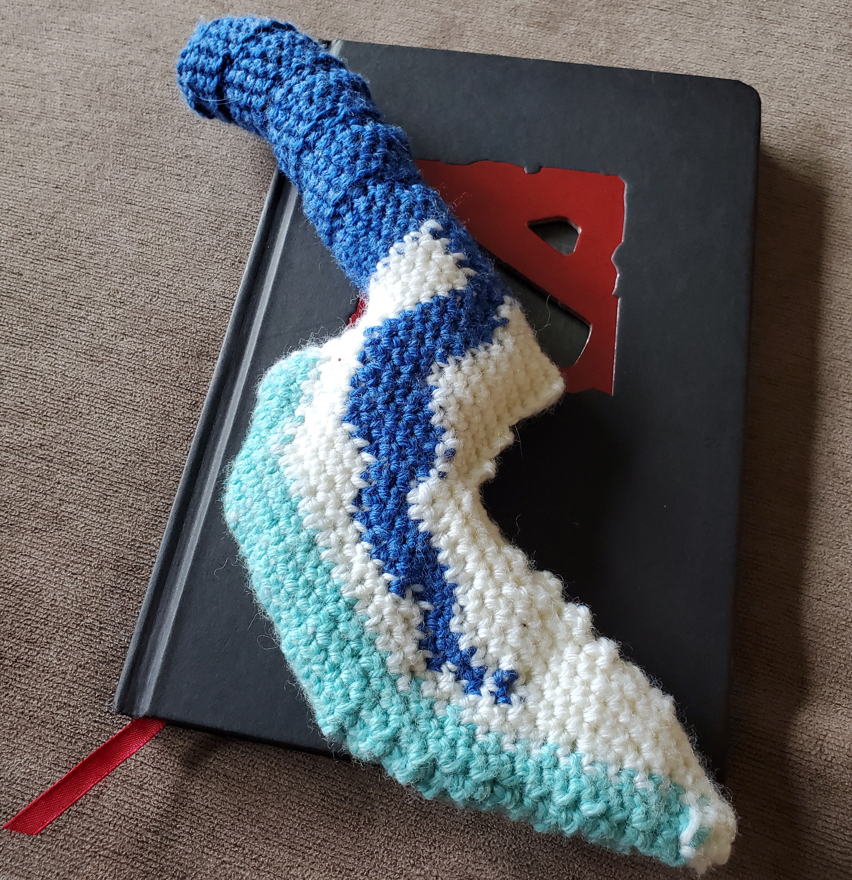 After this row, we’re finished with the dark blue. Cut the yarn and weave in the loose end. This is also a good time to loosely stuff the blade to give it a little structure and shape. Be careful not to overstuff, since you want it to lay fairly flat and not make it too round or cylindrical.
