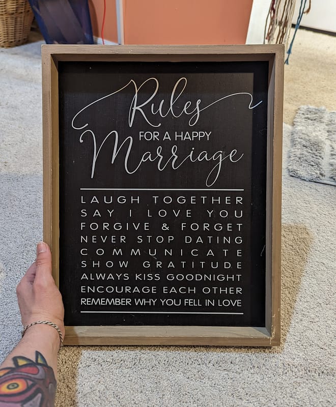 I’d had this project in the back of my mind for a while, so when I spotted this ugly-ass sign at goodwill that had a nice deep frame, I tossed it in my cart and was only mildly embarrassed to be seen purchasing it. seriously, I cannot tell you how much I dislike inspirational-quote-based home decor. so I was actually quite satisfied that I’d be able to turn it into something actually worth hanging up.