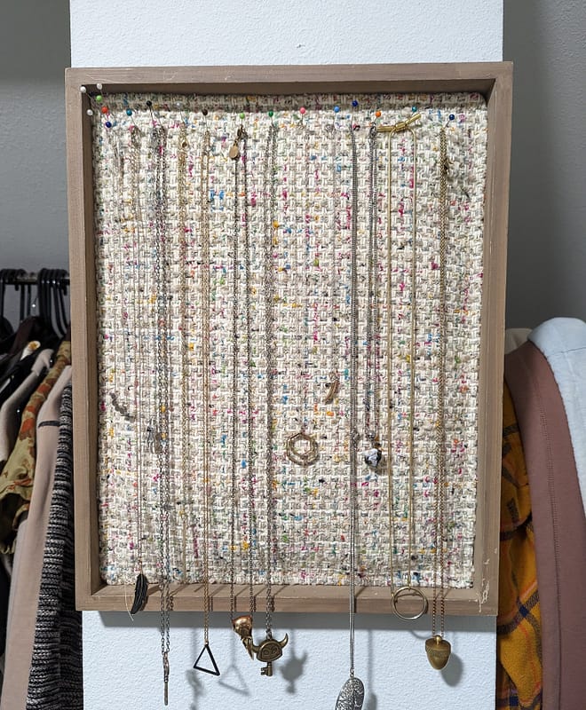 and here’s the finished product! turns out, my necklaces are way too long so they don’t actually all fit within the frame (bummer) but I think it looks pretty cool anyway! and it’s definitely way better than my old solution of throwing them all into a box and hoping they wouldn’t get too tangled. so I’ll be on the lookout for a larger deep frame to make another one at some point!